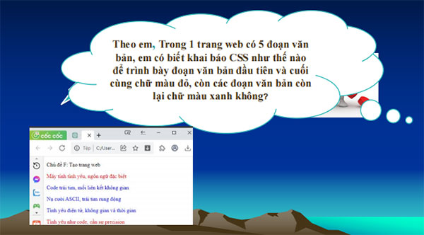 Trong 1 trang web có 5 đoạn văn bản, em có biết khai báo CSS như thế nào để trình bày đoạn văn bản đầu tiên và cuối cùng chữ màu đỏ, còn các đoạn văn bản còn lại chữ màu xanh không?