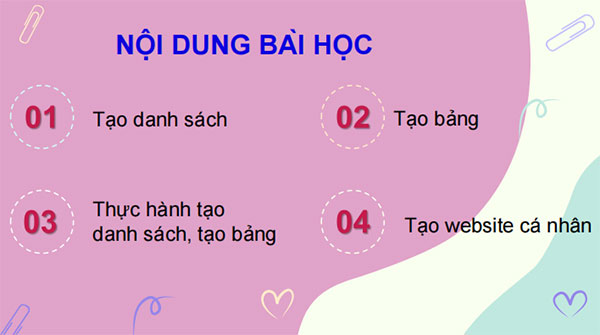 - HS được rèn luyện, bồi dưỡng năng lực khai thác (tạo danh sách, tạo bảng) khi thiết kế nội dung trang web.