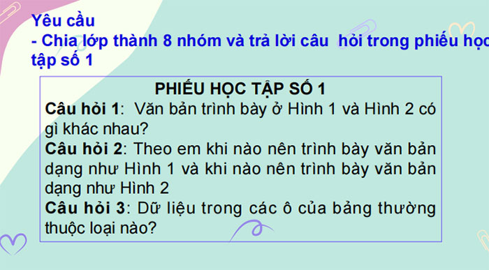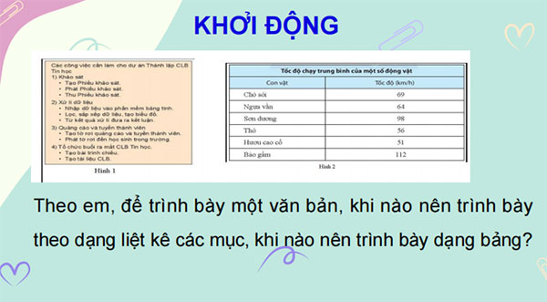 Câu hỏi: Theo em, để trình bày một văn bản, khi nào nên trình bày theo dạng liệt kê các mục và khi nào nên trình bày theo dạng bảng?