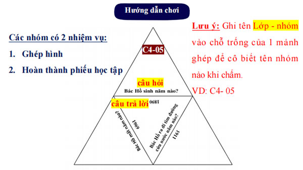 - GV chiếu yêu cầu cần thực hiện, yêu cầu HS tìm hiểu phần 1, 2, 3 SGK trang 54, 55 thảo luận nhóm để thực hiện trò chơi ghép hình và thực hiện ví dụ. |
