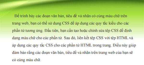 Để trình bày các đoạn văn bản, tiêu đề và nhãn có cùng màu chữ trên trang web, bạn có thể sử dụng CSS để áp dụng các quy tắc kiểu cho các phần tử tương ứng. Đầu tiên, bạn cần tạo hoặc chỉnh sửa tệp CSS để định dạng màu chữ cho các phần tử. Sau đó, liên kết tệp CSS với tệp HTML và áp dụng các quy tắc CSS cho các phần tử HTML trong trang. Điều này giúp đảm bảo rằng các đoạn văn bản, tiêu đề và nhãn trên trang web của bạn sẽ có cùng màu chữ.