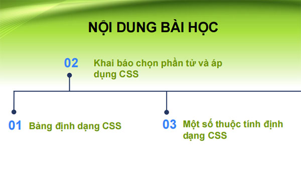 - HS hiểu được bảng định dạng (Cascading Style Sheets-CSS) là ngôn ngữ được sử dụng để khai báo kiểu trình bày các phần tử HTML trong trang web