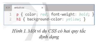 Kết luận, nhận định: GV chốt kiến thức: Bảng định dạng (Cascading Style Sheets-CSS) là ngôn ngữ được sử dụng để khai báo kiểu trình bày các phần tử HTML trong trang web. CSS thường gồm một số quy tắc định dạng. Mỗi quy tắc định danh như minh họa ở Hình 1 gồm bộ chọn ( selector) và các khai báo thuộc tính CSS(css properties)để xác định kiểu trình bày cho phần tử, ví dụ: màu sắc, phông chữ,kích cỡ chữ, đường viền,…..