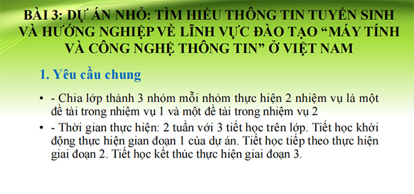 - Bài 3: Dự án nhỏ: Tìm hiểu thông tin tuyển sinh và hướng nghiệp về lĩnh vực đào tạo “Máy tính và Công nghệ thông tin” ở Việt Nam