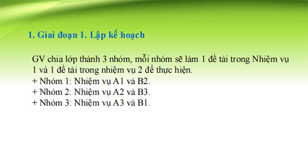 * Bước 4: Kết luận, nhận định: GV chính xác hóa và GV chia lớp thành 3 nhóm, mỗi nhóm thực hiện hai đề tài trong nhiệm vụ 1 và nhiệm vụ 2.