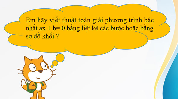 Câu hỏi. Em hãy mô tả thuật toán giải phương trình bậc nhất ax + b = 0 (bằng liệt kê các bước hoặc bằng sơ đồ khối)