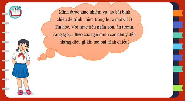 Giới thiệu tình huống để HS bước đầu suy nghĩ về việc giải quyết một vấn đề, một công việc. Với yêu cầu rõ ràng là tạo bài trình chiếu trong lễ ra mắt CLB, HS sẽ đưa ra các phương án trả lời khác nhau cho câu hỏi. Đó có thể là: Bạn An cần chú ý đến nội dung trình chiếu (giới thiệu gì về CLB), hình thức bài trình chiếu (cần làm thật đẹp, thật ấn tượng,...), cách trình bày bài trình chiếu,....