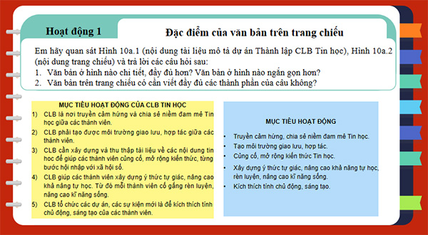 b) Nội dung: HS ngồi theo vị trí nhóm đã được phân công, quan sát Hình 10a.1 và Hình 10a.2 và thảo luận trả lời câu hỏi trong phần hoạt động 1. Từ đó, HS nêu được đặc điểm của văn bản trong trang chiếu.