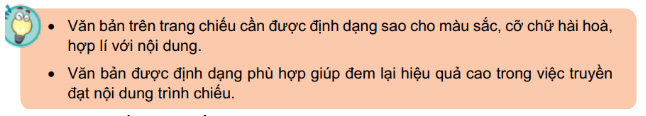 - Khi tạo bài trình chiếu, em hãy nêu một vài điểm chú ý khi lựa chọn màu sắc trên trang chiếu, sự phối hợp về màu nền và màu chữ,