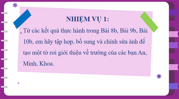 a) Mục tiêu: HS xác định được nhiệm vụ của mỗi nhóm là tạo tờ rơi giới thiệu về trường học có sử dụng các ảnh đã được chỉnh sửa từ các tiết học trước.
