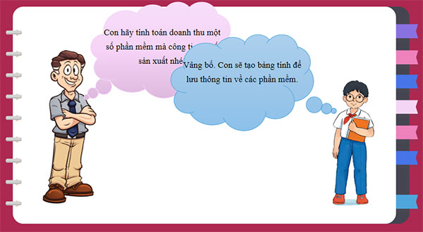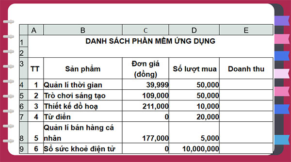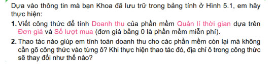 - HS trình bày kết quả của nhóm. GV lưu ý trọng tâm của phần kiến thức này là nhấn mạnh yêu cầu của bài toán tính doanh thu. Doanh thu thay đổi theo từng phần mềm khác nhau. Do đó, cần tạo ra công thức tính toán cho cột E mà các địa chỉ ô thay đổi theo từng dòng tương ứng với mỗi phần mềm khác nhau. Yêu cầu này dẫn đến dùng địa chỉ tương đối trong công thức.