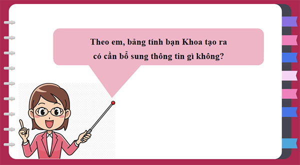 a) Mục tiêu: Hoạt động này đặt HS vào ngữ cảnh thực tế để dẫn đến việc tạo bảng tính lưu trữ và tính toán số liệu. Hoạt động này cũng kết nối với kiến thức về chương trình bảng tính đã học ở lớp 7 sang kiến thức mới của chương trình bảng tính ở lớp 8.