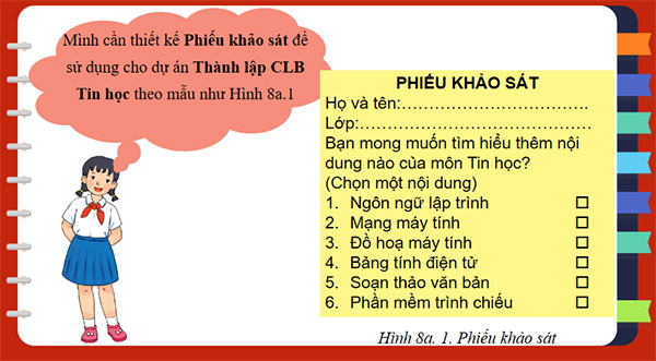 GV đưa ra tình huống nhiệm vụ thiết kế “Phiếu khảo sát” của bạn An, HS đọc tình huống và trả lời các câu hỏi