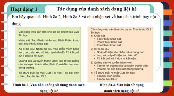 HS ngồi theo vị trí nhóm đã được phân công, quan sát Hình 8a.2 và Hình 8a.3 và thảo luận cho nhận xét về hai cách trình bày nội dung. Từ đó, HS nêu được các kiểu danh sách dạng liệt kê, ưu điểm của việc sử dụng danh sách dạng liệt kê và điền vào phiếu bài tập.