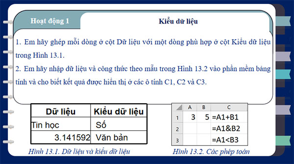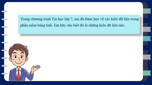 a) Mục tiêu: Đưa hs vào tình huống có vấn đề (kiểu dữ liệu trong chương trình bảng tính mà hs đã được học ở lớp 7)