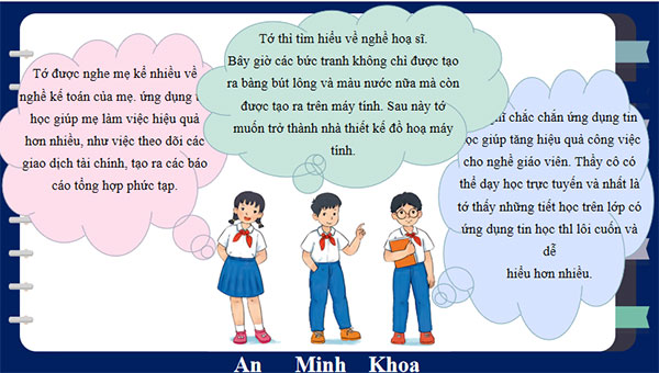 - HS: Tìm hiểu trước (ví dụ phỏng vấn bố mẹ) về nghề nghiệp họ đang làm, trong đó tập trung vào việc họ đã ứng dụng tin học như thế nào?