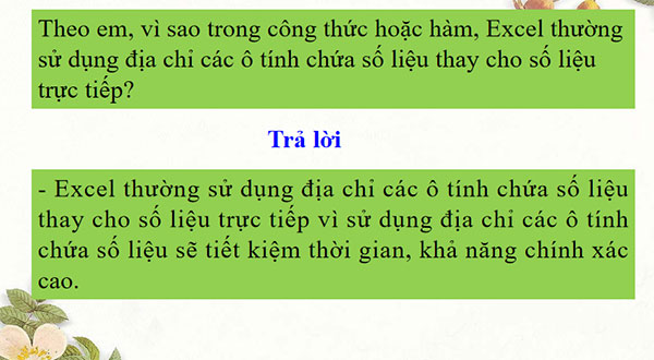 Theo em, vì sao trong công thức/hàm, Excel thường sử dụng địa chỉ các ô tính chứa số liệu thay cho số liệu trực tiếp?