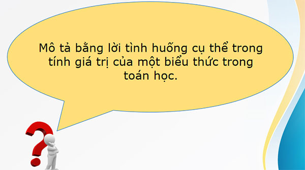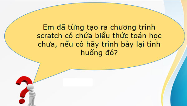 Câu hỏi. Em đã từng tính toán giá trị của một số biểu thức toán học. Nếu em đã từng tạo ra chương trình Scratch có chứa biểu thức toán học thì hãy nêu tình huống sử dụng biểu thức đó