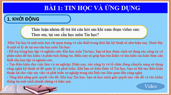 - GV dẫn dắt HS vào bài học: Vậy các em có biết vai trò của môn Tin học và ứng dụng tin học để làm những việc gì không? chúng ta sẽ cùng nhau đi tìm hiểu trong bài học ngày hôm nay – Bài 1: Tin học và ứng dụng