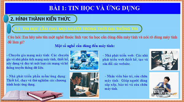 - HS: Tìm hiểu trước về nghề nghiệp họ đang làm và một số ngành nghề thuộc lĩnh vực Tin học, trong đó tập trung vào việc họ đã ứng dụng tin học như thế nào?