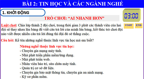 - GV dẫn dắt HS vào bài học: Vậy các em có biết Tin học và các ngành nghề thuộc lĩnh vực tin học là những ngành nào không? chúng ta sẽ cùng nhau đi tìm hiểu trong bài học ngày hôm nay