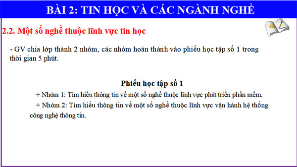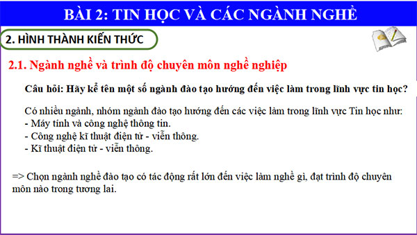 - Hướng HS tới một số công việc đặc thù của mỗi ngành nghề (thông qua những ví dụ về ứng dụng tin học).