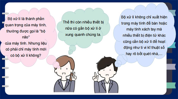 b. Nội dung: GV nêu tình huống khởi động; HS đóng vai các nhân vật trong tình huống, từ đó có hứng thú tìm hiểu những thiết bị có gắn bộ xử lí thông tin.