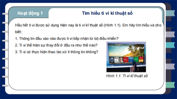 - GV dẫn dắt HS vào bài học: Công nghệ ngày càng phát triển, các thiết bị thông minh ra đời ngày một nhiều giúp cuộc sống con người dễ dàng và thuận tiện hơn, tạo điều kiện cho con người có nhiều thời gian nghỉ ngơi thư giãn hơn. Vậy để hiểu rõ hơn về những thiết bị gắn bộ xử lí, ứng dụng thực tế của máy tính trong khoa học và đời sống cũng như tác động của công nghệ thông tin lên giáo dục và xã hội, chúng ta sẽ cùng nhau đến với Bài 1: Thế giới kĩ thuật số.