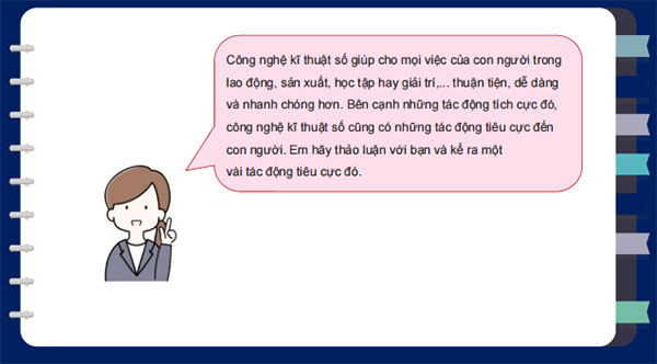 Trong thời đại kĩ thuật số phát triển, hầu hết thông tin đều ở dạng số. Điều này khiến cho đời sống xã hội thay đổi toàn diện. Công nghệ kĩ thuật số giúp cho mọi việc của con người trong lao động, sản xuất, học tập hay giải trí,… thuận tiện, dễ dàng và nhanh chóng hơn. Bên cạnh những tác động tích cực đó, công nghệ kĩ thuật số cũng có những tác động tiêu cực đến con người. Em hãy thảo luận với bạn và kể ra một vài tác động tiêu cực đó.