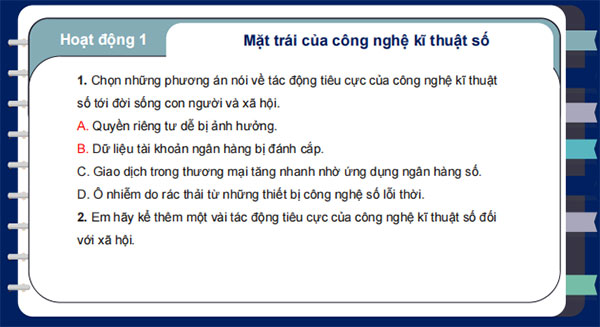 - Thông qua câu trả lời của HS, GV yêu cầu HS rút ra kết luận về tác động tiêu cực của công nghệ kĩ thuật số. - Để củng cố kiến thức, GV yêu cầu HS trả lời Câu hỏi SGK tr.16: 1. Phương án nào sau đây không phải là tác động tiêu cực của công nghệ kĩ thuật số đến đời sống con người? A. Nhờ trí tuệ nhân tạo làm bài tập về nhà. B. Truy cập mạng xã hội trong nhiều giờ. C. Thường xuyên sử dụng phần mềm soạn thảo văn bản để làm báo cáo. D. Vừa ăn vừa xem video trên trang YouTube. 2. Những phương án nào sau đây là tác động tiêu cực của công nghệ kĩ thuật số đến xã hội? A. Thông tin cá nhân của con người được số hoá. B. Sử dụng thiết bị số liên tục trong thời gian dài ảnh hưởng đến sức khỏe thể chất và tinh thần của lớp trẻ. C. Gia tăng ô nhiễm môi trường. D. Làm gia tăng tỉ lệ thất nghiệp. Bước 2: HS thực hiện nhiệm vụ học tập - HS đọc nội dung mục 1 SGK tr.15 - 16, thảo luận nhóm thực hiện nhiệm vụ được giao. - GV hướng dẫn, theo dõi, hỗ trợ HS nếu cần thiết. Bước 3: Báo cáo kết quả hoạt động và thảo luận - GV mời 2 - 4 nhóm đại diện trình bày Phiếu học tập số 1: 1. Đáp án A, B. - Một số HS xung phong trả lời Câu hỏi SGK tr.16: 1. C; 2. B, D. - HS khác lắng nghe, nhận xét và bổ sung. Bước 4: Đánh giá kết quả, thực hiện nhiệm vụ học tập - GV nhận xét sản phẩm của các nhóm, đánh giá thái độ làm việc của HS trong nhóm. - GV lưu ý HS: Trong phương án D, rác thải từ những thiết bị công nghệ số lỗi thời tác động tiêu cực chủ yếu tới kinh tế và chiếm tỉ trọng không cao so với các loại ô nhiễm khác. - GV kết luận, chuẩn hóa kiến thức theo hộp kiến thức tr.16, yêu cầu HS ghi chép đầy đủ vào vở. - GV chuyển sang hoạt động tiếp theo. |