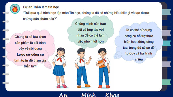 “Trải qua quá trình học tập môn Tin học, chúng ta đã có những hiểu biết gì và tạo được những sản phẩm nào?” Đó là câu hỏi đặt ra với các bạn học sinh lớp 9A. Để tổng kết một chặng đường học tập môn Tin học, các bạn đã quyết định tổ chức Triển lãm tin học. Có rất nhiều ý tưởng về sản phẩm trưng bày trong triển lãm. Có nhóm trưng bày sổ lưu niệm của lớp đã làm từ lớp 6. Có nhóm trưng bày bộ sưu tập hình ảnh về CLB Tin học được thành lập từ lớp 8. Nhóm khác lại muốn tạo sản phẩm là một số trò chơi bằng ngôn ngữ lập trình trực quan,… Nhóm ba bạn An, Minh, Khoa lựa chọn sản phẩm là bài trình bày về nội dung Lược sử công cụ tính toán để tham gia triển lãm.