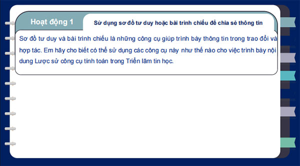 Việc tổ chức một hoạt động như Triển lãm tin học cần làm việc nhóm, cần sự cộng tác của nhiều người. Có nhiều công cụ hỗ trợ thực hiện hoạt động cộng tác, trong đó có sơ đồ tư duy và bài trình chiếu. Tuy nhiên, việc sử dụng sơ đồ tư duy hay bài trình chiếu không chỉ là vấn đề kĩ thuật, mà cần được hướng dẫn về cách làm việc hợp tác để công cụ hỗ trợ hiệu quả cho một nhóm cùng nhau thực hiện dự án.