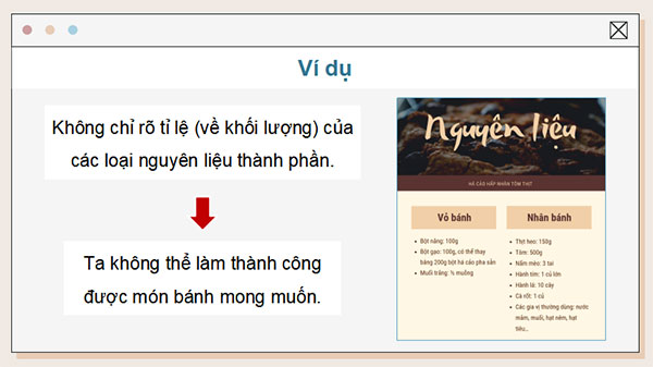 Ví dụ: Khi ta có một bản mô tả các bước làm một loại bánh nhưng nếu trong đó không chỉ rõ tỉ lệ (về khối lượng) của các loại nguyên liệu thành phần, thì ta cũng không thể làm thành công được món bánh mong muốn.
