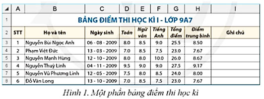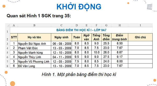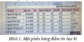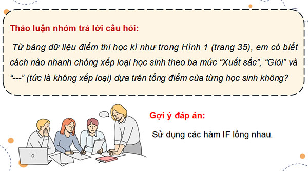 Từ bảng dữ liệu điểm thi học kì như trong Hình 1 (trang 35), em có biết cách nào nhanh chóng xếp loại học sinh theo ba mức “Xuất sắc”, “Giỏi” và “---” (tức là không xếp loại) dựa trên tổng điểm của từng học sinh không?