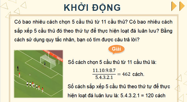 Áp dụng quy tắc nhân có: 5.4.3.2.1 = 120 cách sắp xếp 5 cầu thủ từ 11 cầu thủ.
