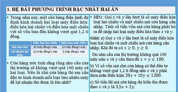 - Biết biểu diễn miền nghiệm của hệ bất phương trình bậc nhất hai ẩn trên mặt phẳng tọa độ.
