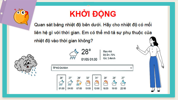 - Trong HĐKP1, nhiệt độ dự báo là một đại lượng phụ thuộc vào thời điểm (giờ). Mối quan hệ giữa hai đại lương này (nhiệt độ và thời gian) có các đặc trưng của một hàm số.