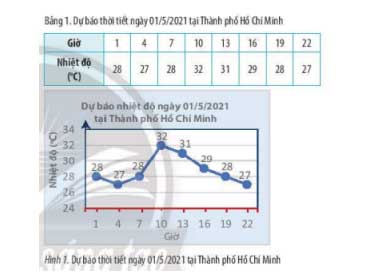 Bản tin dự báo thời tiết cho biết nhiệt độ ở một số thời điểm trong ngày 01/5/2021 tại Thành phố Hồ Chí Minh đã được ghi lại thành bảng kèm với biểu đồ bên. Sử dụng bảng hoặc biểu đồ, hãy: