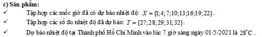 - Hỏi 3: Cho biết nhiệt độ dự báo tại Thành phố Hồ Chí Minh vào lúc 7 giờ sáng ngày 01/5/2021.