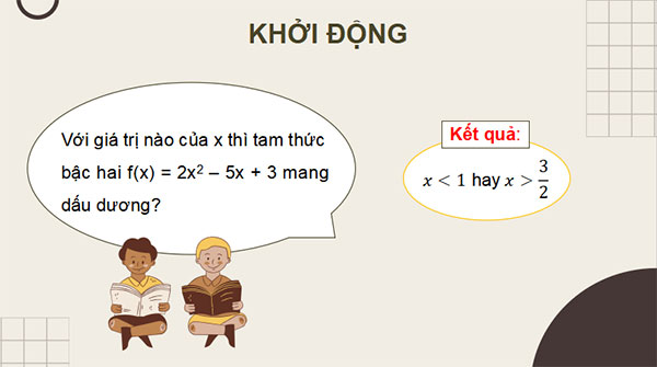 - Dẫn nhập vào bài toán bất phương trình bậc hai từ kiến thức đã học về dấu của tam thức bậc hai ở bài trước.