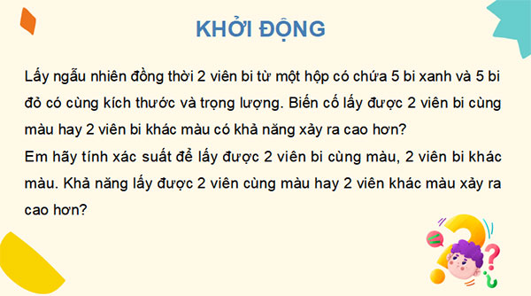 Lấy ngẫu nhiên đồng thời 2 viên bi từ một hộp có chứa 5 bi xanh và 5 bi đỏ có cùng kích thước và trọng lượng. Biến cố lấy được 2 viên bi cùng màu hay 2 viên bi khác màu có khả năng xảy ra cao hơn?