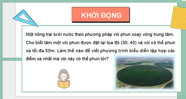 Một nông trại tưới nước theo phương pháp vòi phun xoay vòng trung tâm. Cho biết tâm một vòi phun được đặt tại tọa độ (30; 40) và vòi có thể phun xa tối đa 50m. Làm thế nào để viết phương trình biểu diễn tập hợp các điểm xa nhất mà vòi này có thể phun tới?