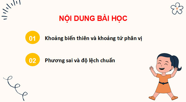 - Tính được số đặc trưng đo mức độ phân tán của mẫu số liệu không ghép nhóm: khoảng biến thiên, khoảng tứ phân vị, phương sai, độ lệch chuẩn.