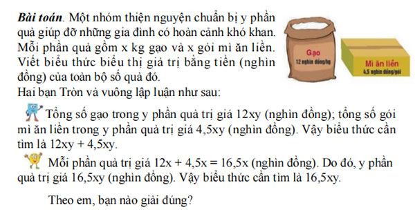 Bước 4: Kết luận, nhận định: GV ghi nhận câu trả lời của HS, trên cơ sở đó dẫn dắt HS vào tìm hiểu bài học mới: “Bài học ngày hôm nay sẽ giúp các em biết được biểu thức liên hệ giữa giá trị của số gạo và số mì ăn liền trong phần quà ở phần mở đầu trên”.