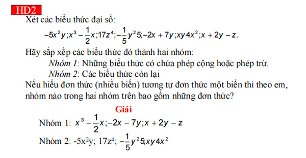 Bước 1: Chuyển giao nhiệm vụ: - GV yêu cầu HS thảo luận nhóm thực hiện HĐ1 và HĐ2 để mô hình hoá bài toán nêu trong tình huống mở đầu. GV chữa bài, chốt đáp án. - GV dẫn dắt, đặt câu hỏi và rút ra kết luận trong hộp kiến thức (GV đặt câu hỏi dẫn dắt: “Từ những ví dụ ở HĐ1 và HĐ2 chúng ta có thể thấy là những đơn thức. Vậy đơn thức là gì?”). - GV mời một vài HS đọc khung kiến thức trọng tâm. - GV phân tích đề bài Ví dụ 1, vấn đáp, gợi mở giúp HS nhận biết đơn thức không chứa phép cộng và căn bậc hai. + Em hãy nêu lại khái niệm đơn thức. + Dựa vào định nghĩa, HS hoàn thành bài tập Ví dụ 1 vào vở cá nhân, sau đó trao đổi cặp đôi tranh luận và thống nhất đáp án. GV gọi một vài HS trình bày kết quả. - HS nhận biết đơn thức thông qua việc hoàn thành bài Luyện tập 1 trong SGK. - GV cho HS thảo luận nhóm phần Tranh luận để củng cố các khái niệm đơn thức. - GV yêu cầu HS quan sát hai đơn thức và trong SGK – tr.7 |
