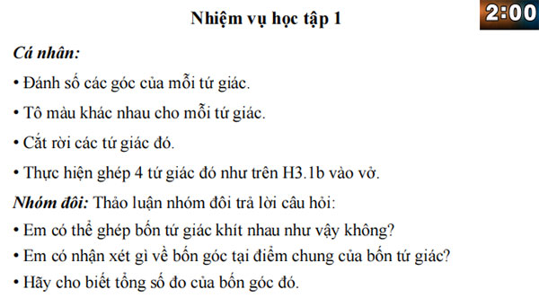 - Giải thích được tại sao tổng bốn góc của tứ giác lồi bằng 3600. Chú ý quy ước dùng chữ “tứ giác” thay cho chữ “tứ giác lồi.