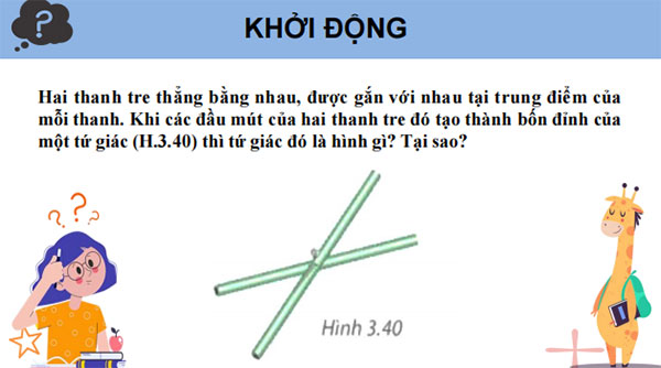 * GV giao nhiệm vụ học tập: Hai thanh tre thẳng bằng nhau, được gắn với nhau tại trung điểm của mỗi thanh. Khi các đầu mút của hai thanh tre đó tạo thành bốn đỉnh của một tứ giác (H.3.40) thì tứ giác đó là hình gì? Tại sao? * HS thực hiện nhiệm vụ: Học sinh suy nghĩ khi thực hiện bài học và vấn đề được giải quyết khi thực hiện vận dụng cuối bài * Báo cáo, thảo luận: GV gọi một số HS đưa ra dự đoán cho câu hỏi mở đầu, HS khác nhận xét. * Kết luận, nhận định: Từ câu trả lời của HS, GV dẫn dắt kết nối HS vào bài học mới. |