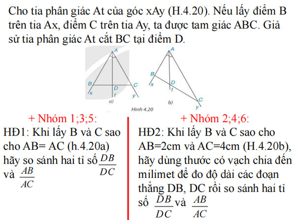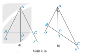 Cho tia phân giác At của góc xAy (H.4.20). Nếu lây điểm B trên tia Ax, điểm C trên tia Ay, ta được tam giác ABC. Giả sử tia phân giác At căt BC tại điểm D.