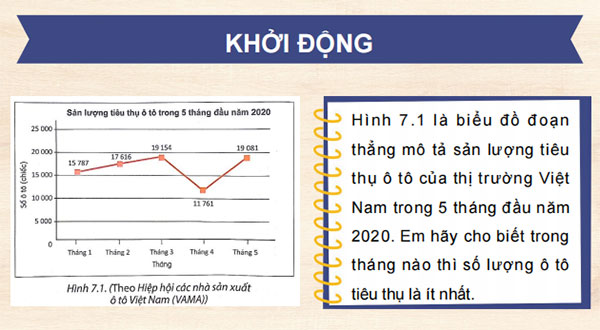 b) Nội dung: GV nêu tình huống liên quan đến cách đọc thông tin từ biểu đồ đoạn thẳng, là kĩ năng HS đã được học ở lớp 7.