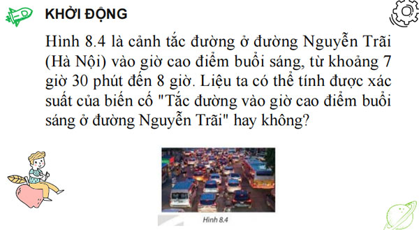 * Giao nhiệm vụ học tập - GV treo/trình chiếu nội dung bài tập và yêu cầu HS thực hiện. * Thực hiện nhiệm vụ - HS đọc và suy nghĩ một số dự đoán về tính xác suất của biến cố "Tắc đường vào giờ cao điểm buổi sáng ở đường Nguyễn Trãi". * Báo cáo, thảo luận - HS suy nghĩ trả lời các câu hỏi của GV. - HS cả lớp quan sát nhận xét câu trả lời của bạn. * Kết luận, nhận định - GV theo dõi, hướng dẫn, giúp đỡ HS thực hiện nhiệm vụ và dẫn dắt vào nội dung bài học. |